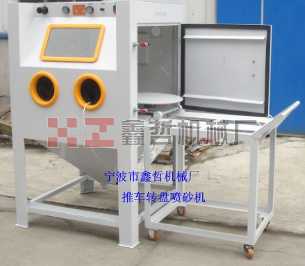 2、加裝活動臺車和轉(zhuǎn)盤,操作時僅需將工件放在臺車轉(zhuǎn)盤上,然后將工件推入機內(nèi)即可從事噴砂作業(yè),十分簡單省力,可加裝定時加熱器防止玻璃珠 受潮。